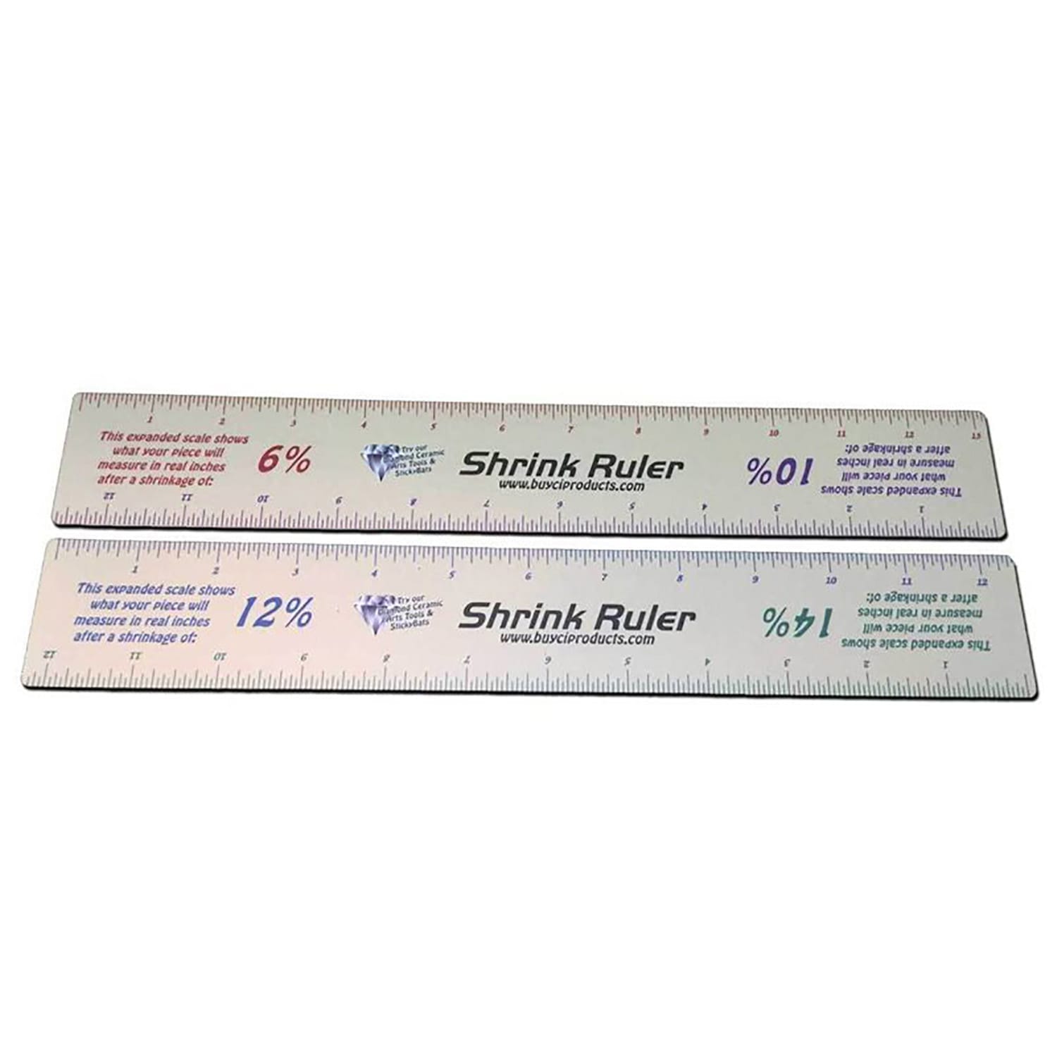 An innovative way to measure the shrinkage of your clay. Works great when making replacement lids for a casserole dish that has been bisque fired. This flexible two-sided plastic ruler has 4 clay shrinkage percentages to aid in matching lids to bowls etc. 14% 12%, 10%, 6%. ( The photos show both sides of the same ruler, 6% and 10% on one side and 12% and 14% on the other side.) Directions: How to use your shrinkage ruler To replace a lid for a casserole dish that has been bisque fired, measure the casserole dish with a regular ruler. Using that same measurement, measure your wet clay with the Shrink Ruler on the side with the closest shrinkage rate to your wet clay. To replace a lid for a casserole dish that has been glaze fired, measure the casserole dish with a regular ruler. Using that same measurement measure your wet clay with the Shrink Ruler on the side with the closest shrinkage rate to yours. Example: If you want a piece to measure 8” after 12% shrinkage, use the 12% scale on the Shrink Ruler to measure 8” on the wet clay. How to measure the shrinkage rate of your clay Make a rectangular clay slab as thick as you plan to make your piece and 4” X 12”, then with a regular ruler measure and carve a 10” line in the wet clay. Bisque fire the clay slab. Measure the length of the same line again with the regular ruler. Use the following formula to solve for S: S=(1-F/M)x100 M=length of line in original moist clay slab (with regular ruler) S=percentage of shrinkage, F= length of line in finished clay slab (with regular ruler). Fire the clay slab to maturity and repeat steps 3 and 4 (this will allow you to determine the shrinkage of your clay after both bisque and glaze fired).
