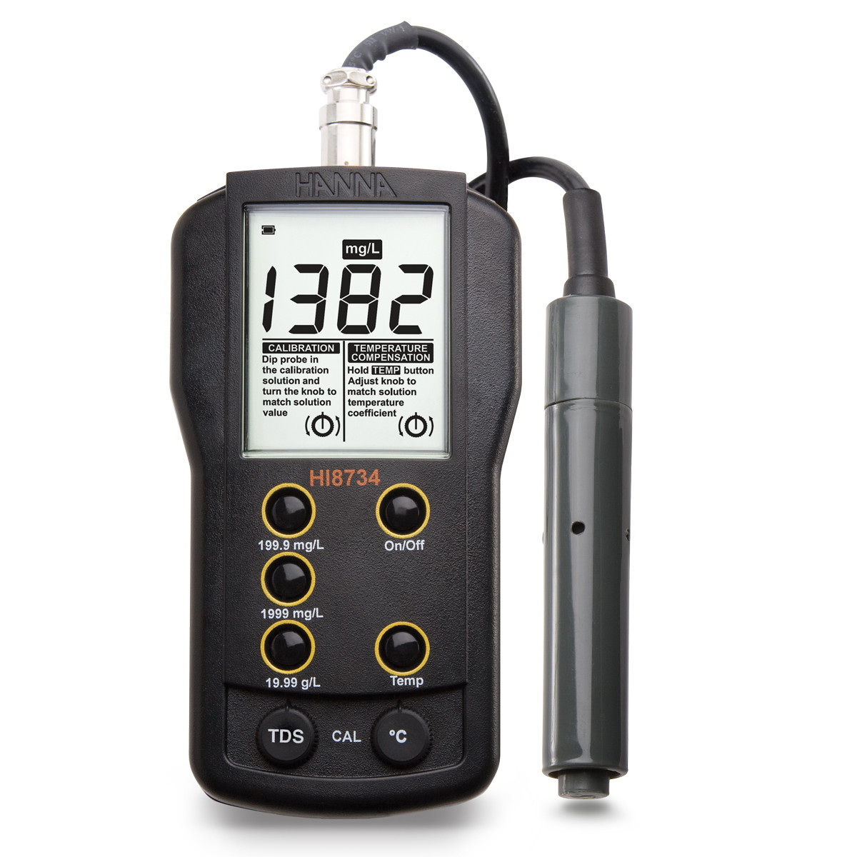 The HI8734 is a rugged, portable TDS meter designed for use in a wide variety of environmental conditions. It is supplied with a four-ring conductivity probe to allow for three ranges of measurement. TDS readings are adjusted with manual temperature compensation, assuring users of consistent and accurate measurements of total dissolved solids.