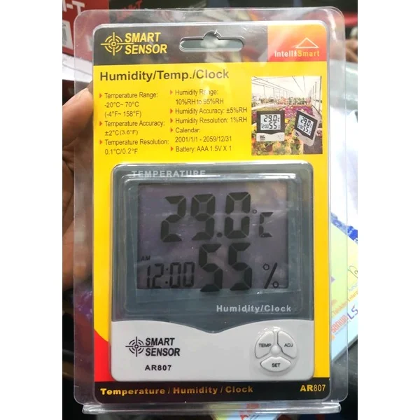 Smart Sensor Temperature Humidity Clock Meter AR807 is an instrument used for measuring the moisture content in the atmosphere. Humidity measurement instruments usually rely on measurements of some other quantity, such as temperature, pressure, mass, or a mechanical or electrical change in a substance as moisture is absorbed. By calibration and calculation, these measured quantities can lead to a measurement of humidity. Modern electronic devices use changes in electrical capacitance or resistance to measure humidity differences.